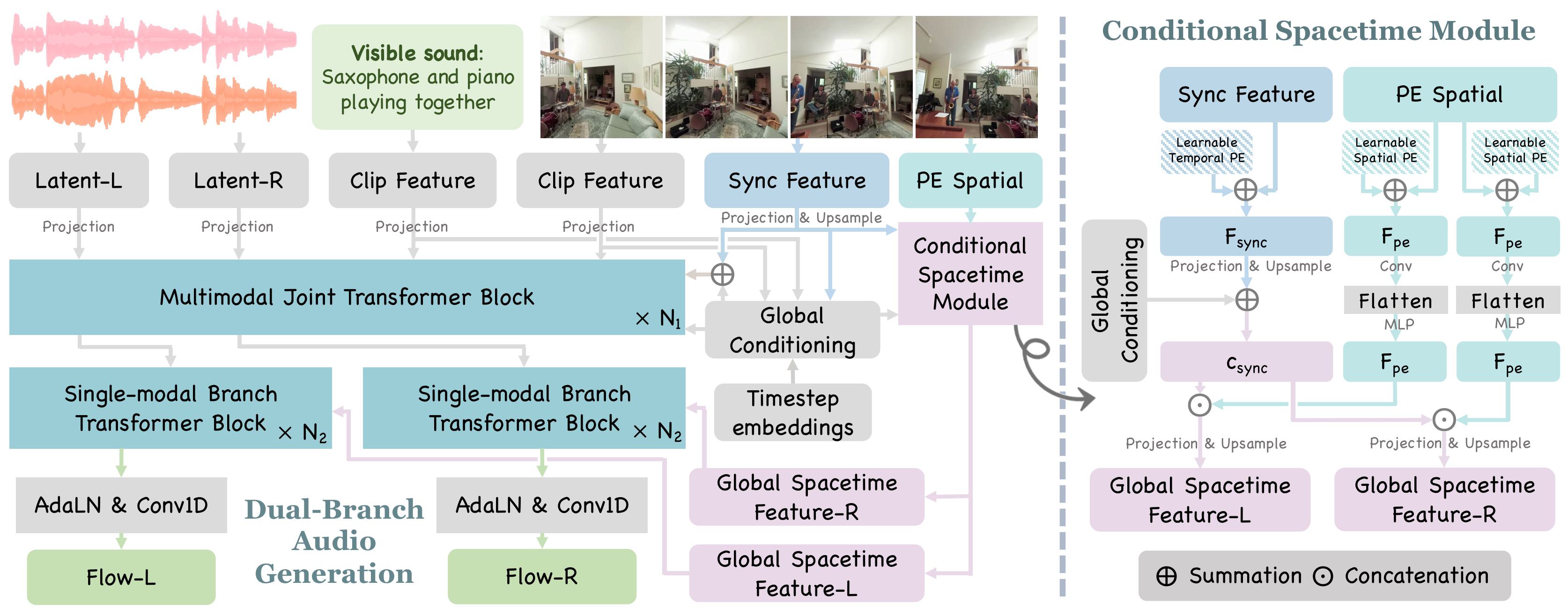 ViSAudio Network Architecture. Left: We adopt Dual-Branch Audio Generation, where two dedicated branches independently predict the left and right audio flows. Right: A Conditional Spacetime Module extracts spatiotemporal cues from the video and injects them into the generation process, improving spatio-temporal alignment between audio and video.