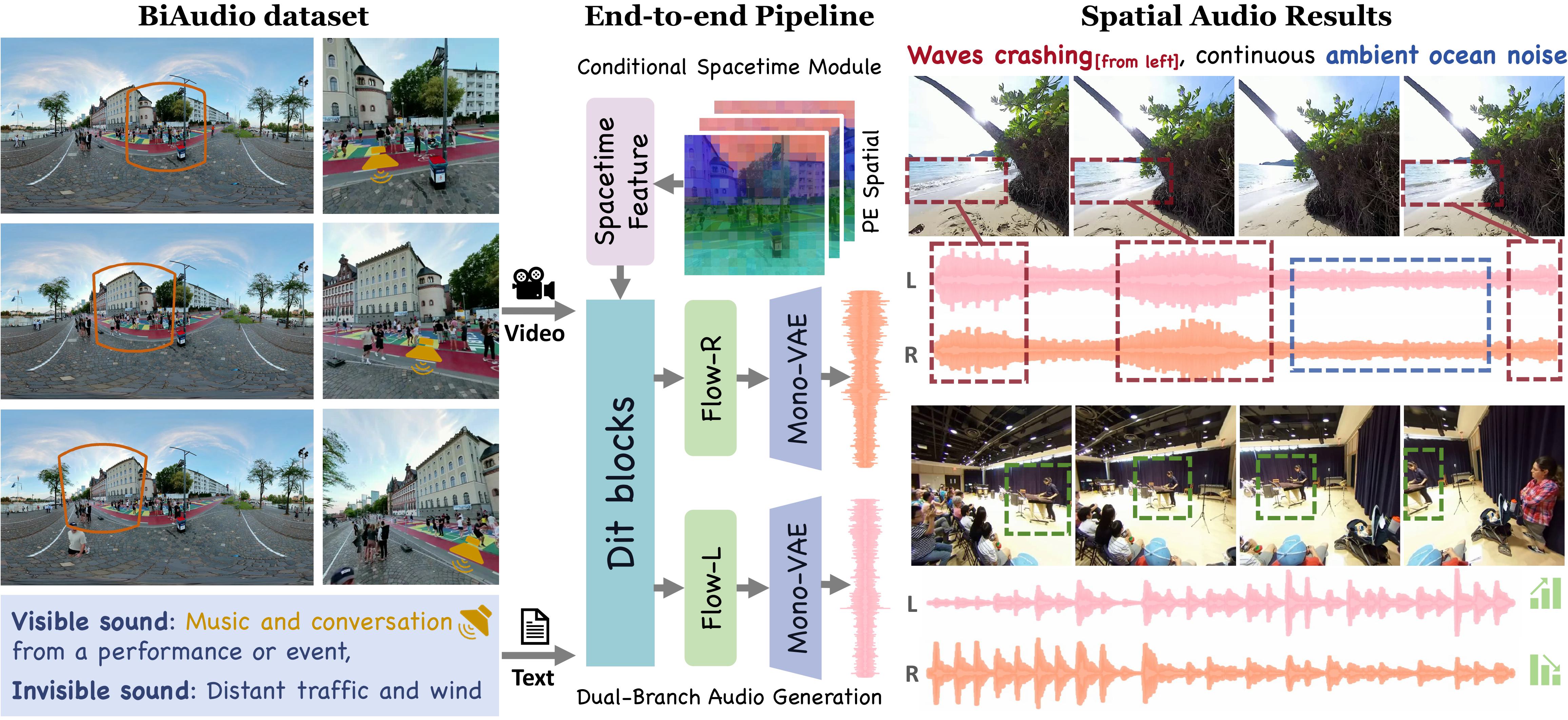 Overview. Left: The BiAudio dataset converts 360° videos and FOA audio into perspective video and binaural audio pairs, employing diverse camera rotations to enhance spatial cues. Middle: Our end-to-end pipeline employs conditional flow matching with a dual-branch generation architecture, integrated with a conditional spacetime module to generate spatially immersive binaural audio from multimodal inputs. Right: Example results generated by ViSAudio. As shown above, our model faithfully generates the visible sound of waves crashing, highlighted with red boxes in both the video frames and the audio waveform, with the left channel louder since the sound event occurs on the left. It also captures subtle environmental sounds like ocean noise, highlighted with blue boxes, demonstrating its ability to reproduce fine-grained background acoustics. As shown below, as the camera rotates right, the marimba sound moves left, increasing left-channel amplitude while decreasing the right, demonstrating dynamic adaptation to viewpoint changes.